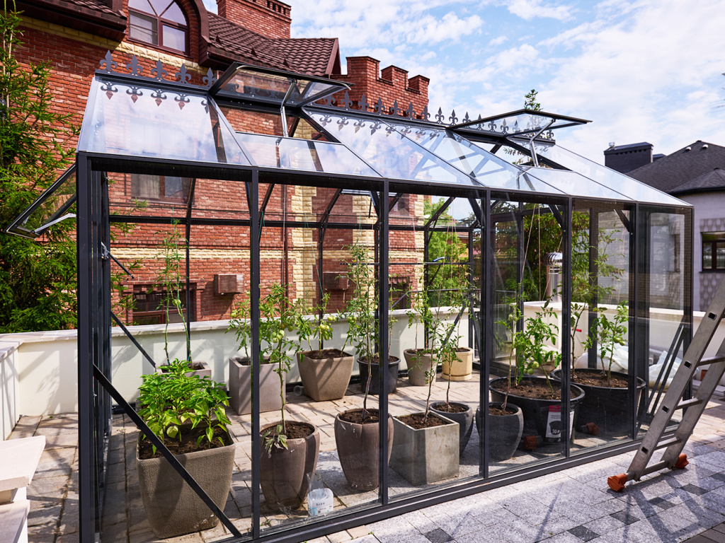 БИОНИКА Классик две теплицы на участке БИОНИКА стеклянная английская теплица на крыше Бионика классик английская теплица от Гласс ХАУС